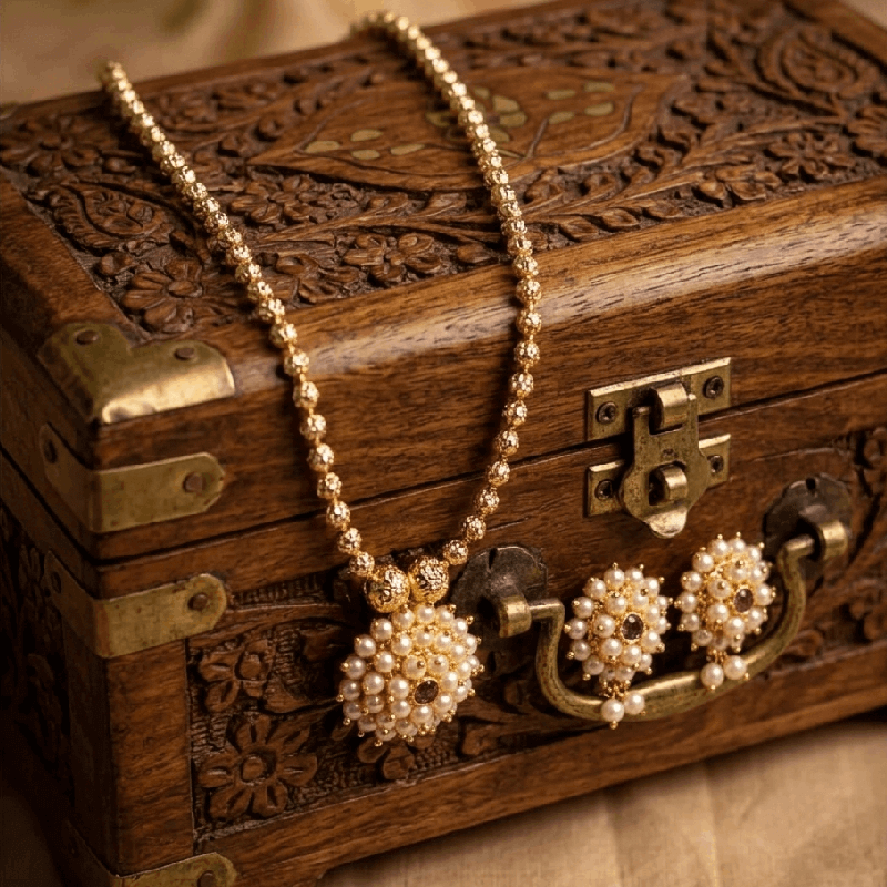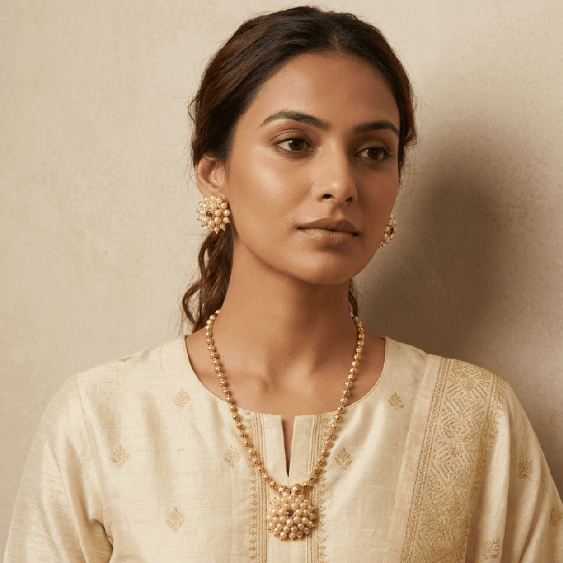 A delicate necklace set with a floral pearl pendant and soft stone accents. Inspired by Maharashtrian traditional jewellery, it offers a graceful and subtle festive look. Perfect for daily festive wear and small occasions.
