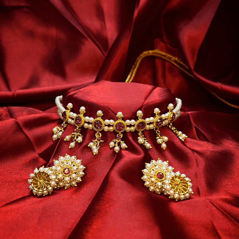 This classic pearl choker set with ruby stone detailing that reflects traditional Maharashtrian elegance of Chinchpeti. The layered pearls give a rich look while remaining easy to wear. Perfect for festive occasions and nauwari sarees.